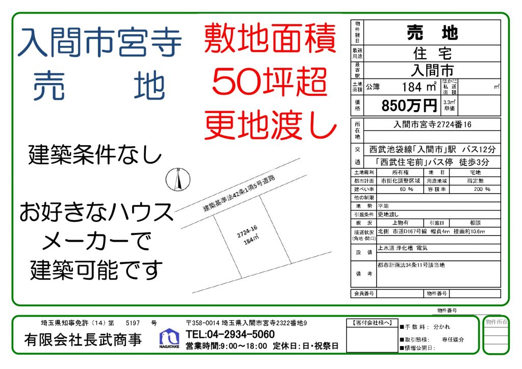 入間市宮寺 売地(55坪) 850万円 184.00m² 物件の詳細を見る 価格 850万円 売地 坪単価 所在地 埼玉県入間市 宮寺2724-16 入間市宮寺2724番地 売地 交通 西武池袋線入間市駅 徒歩3分 バス(西武住宅前 乗12分) 面積 土地 184.00m² 建蔽率/容積率 60% / 200% 区画番号 現況 上物有(更地引渡可) 物件番号 100131337892 設備・条件 排水下水 排水浄化槽